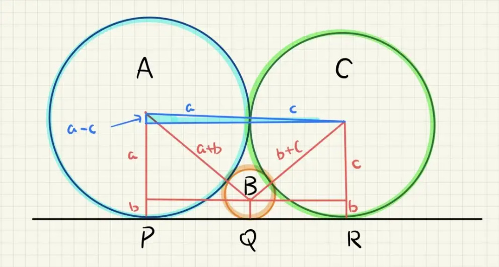 The conventional approach is to connect all the circles’ centres to the points of tangential contact. We can then form a couple of right-angled triangles as shown above.