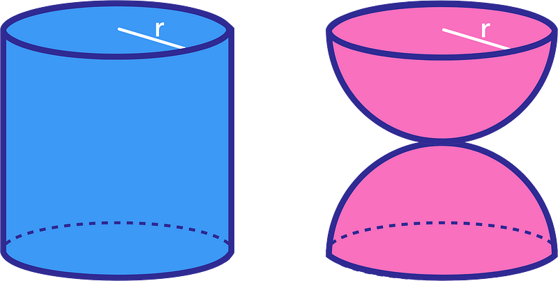 The red figure at the right is made of two hemispheres of equal radius. The blue cylinder at the left has the same radius and height as the red figure.
