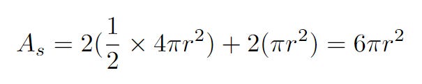 The total surface area of the two hemispheres in pink is equal to the sum of the curved surface area and the sum of the two base circles (one on top, one at the bottom). And the curved surface area of each of these hemispheres is half the surface area of a sphere.